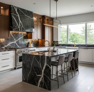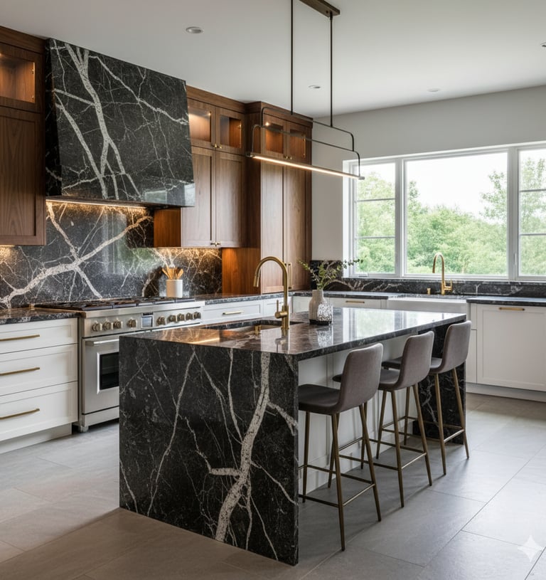 Deep, polished black granite with striking white veining—the epitome of contemporary elegance.
